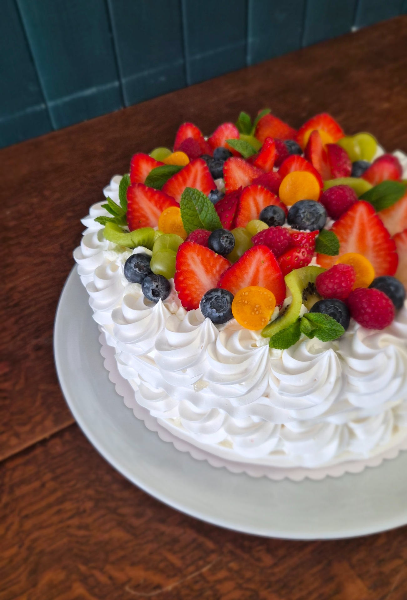 Sněhový bílkový korpus s čerstvě vyšlehanou a neochucenou šlehačkou bez ztužovače a aktuálním ovocem.