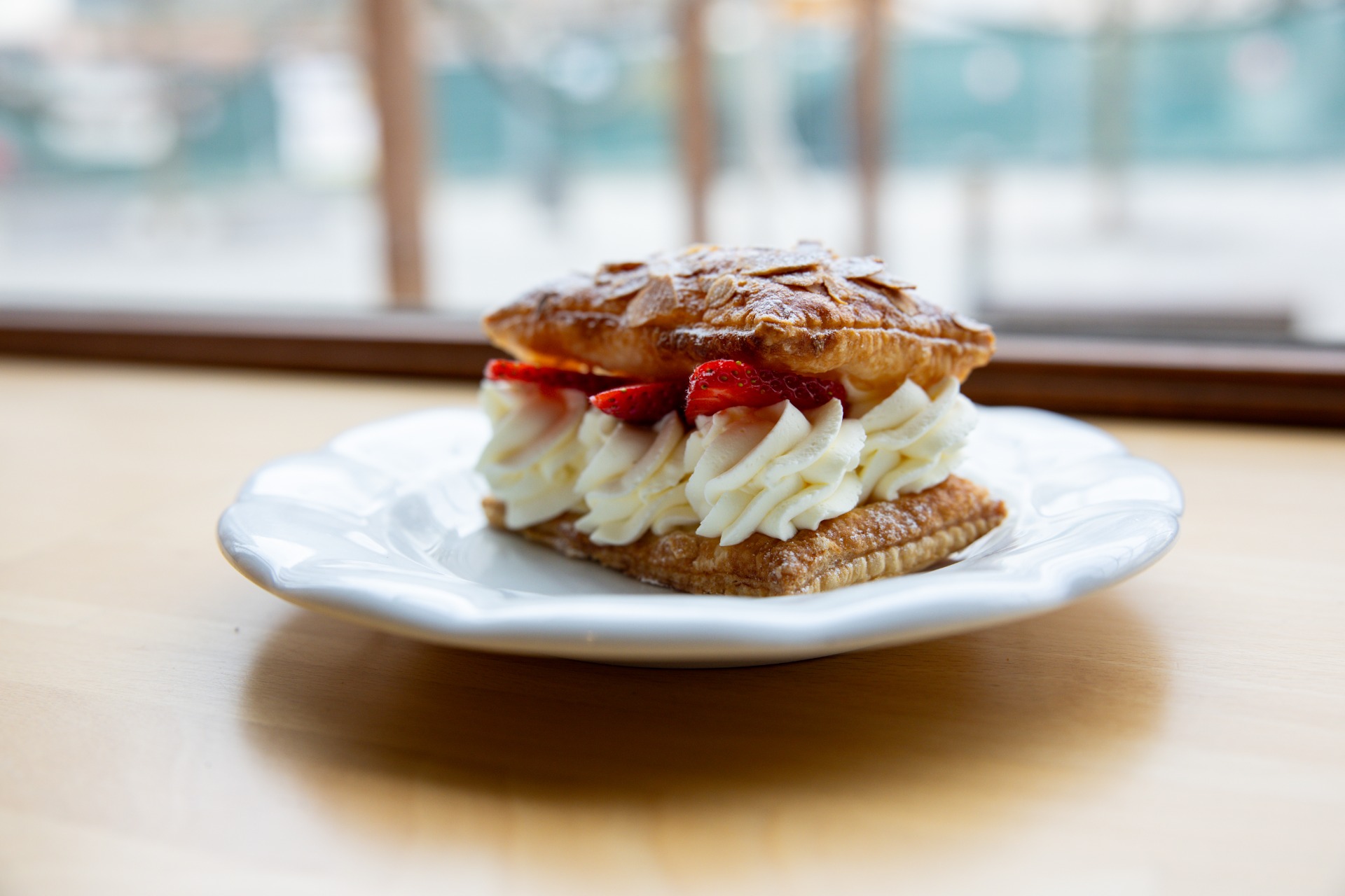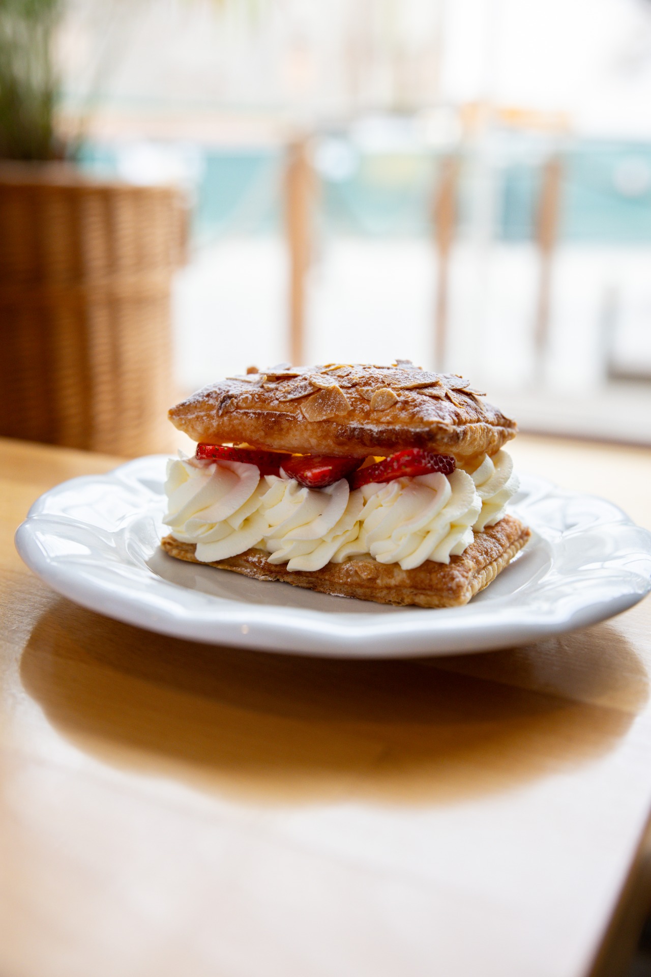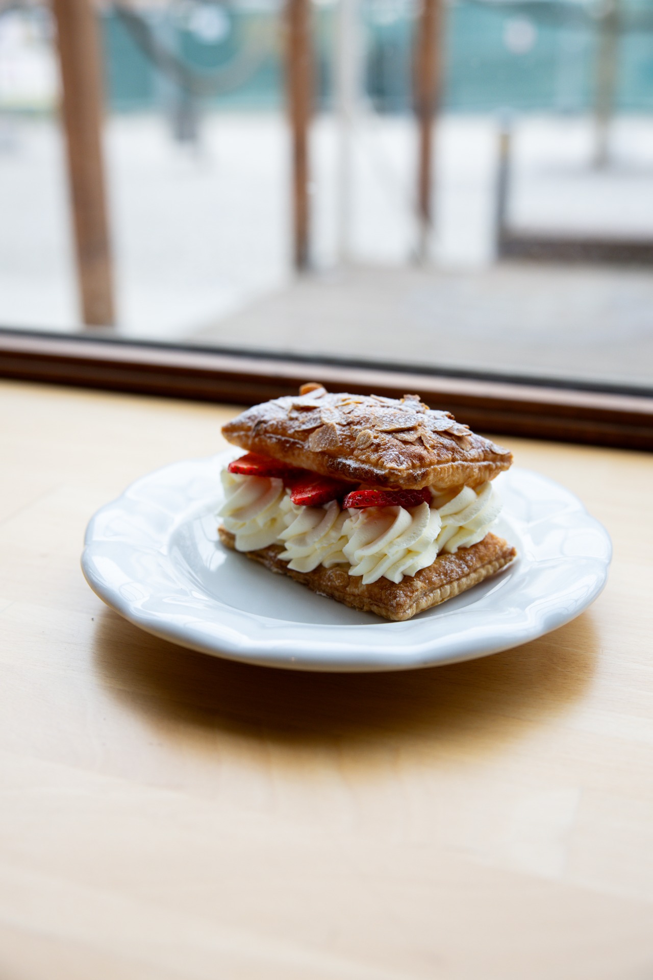 Křehké listové těsto s mandličkami, uvnitř lehký mascarpone-smetanový krém s likérem, zdobený čerstvým sezónním ovocem. Oblíbená klasika, kterou servírky doporučují.