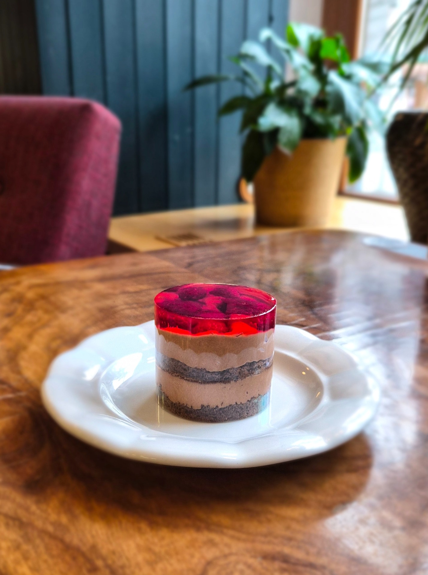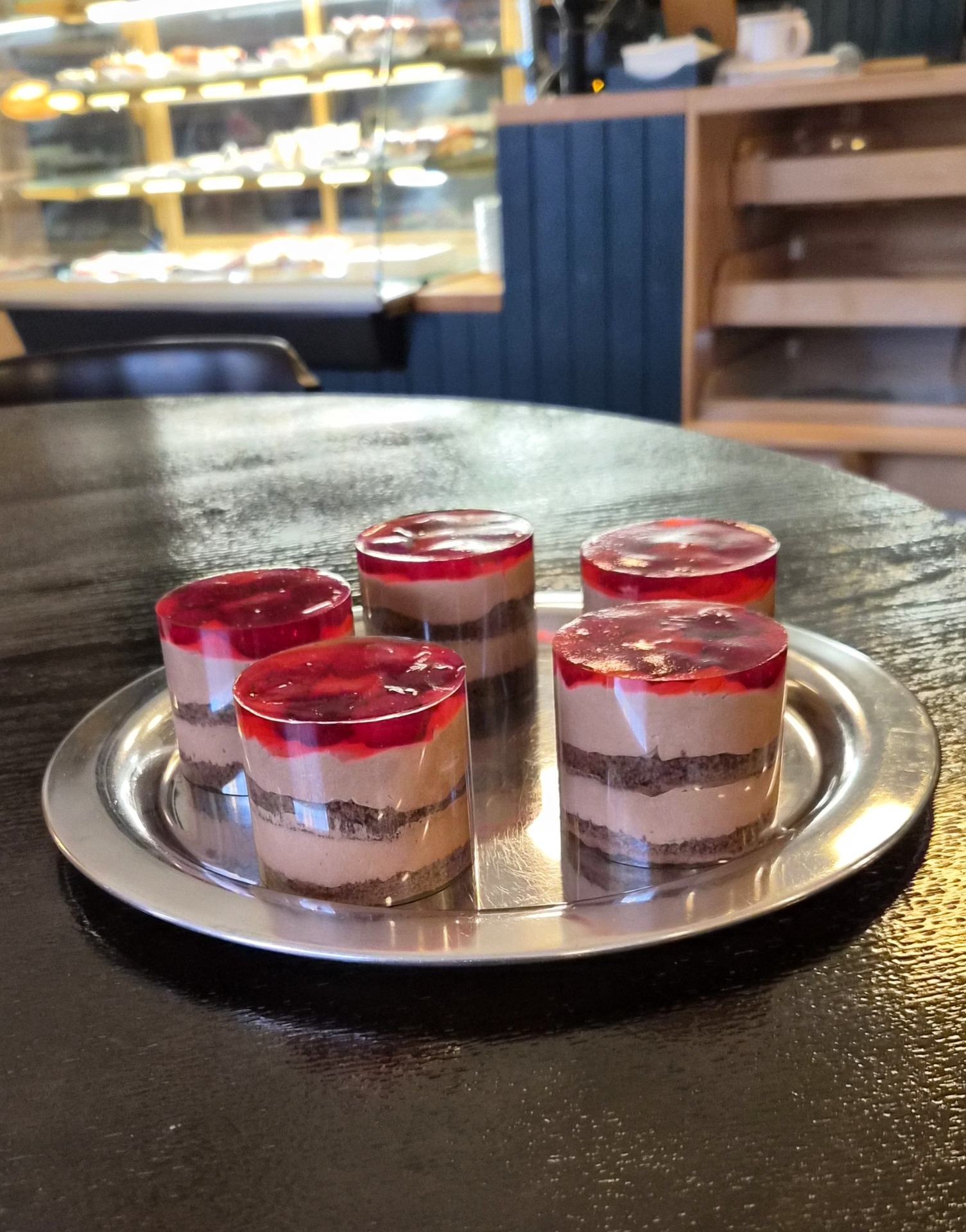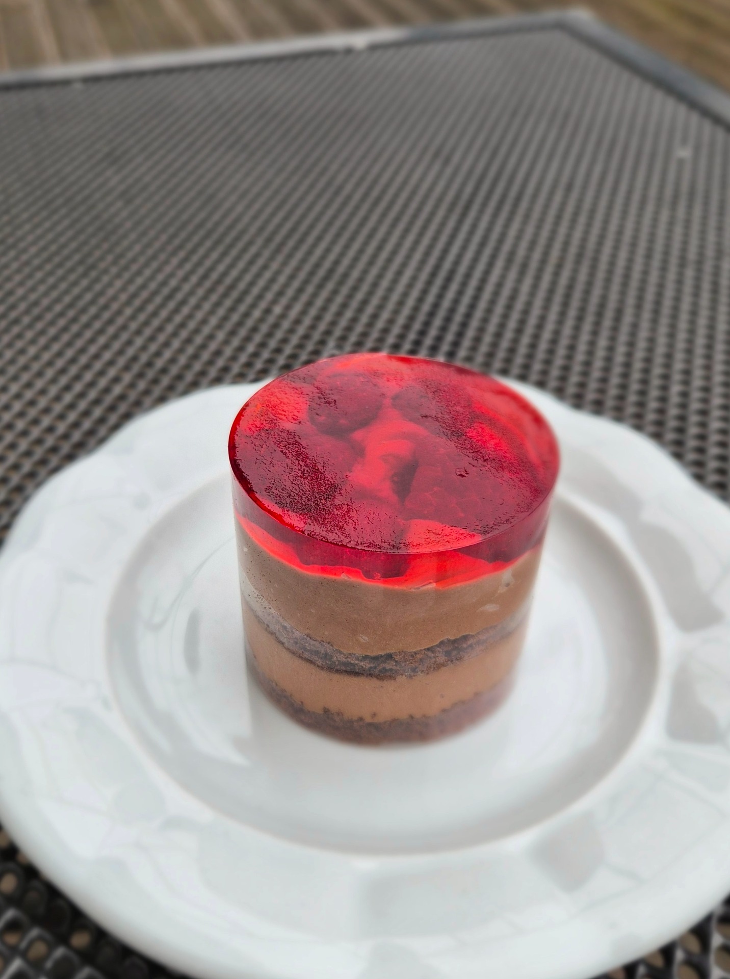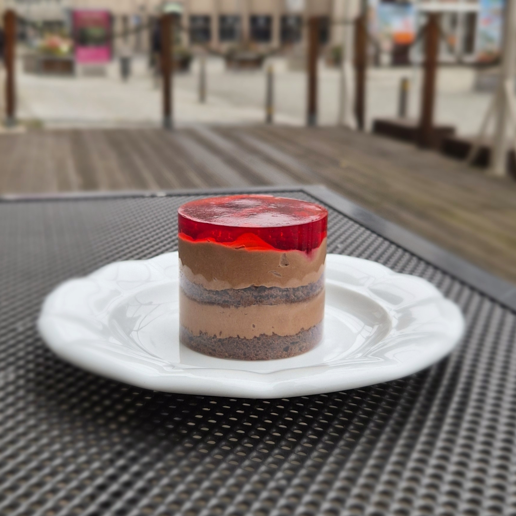 Jemný piškot se žloutkovým krémem, který můžeme na přání dochutit Nutellou. Nahoru přidáváme maliny nebo višně, které zaléváme lehkým přírodním agarem. Svěží, krémový a krásně ovocný dezert.