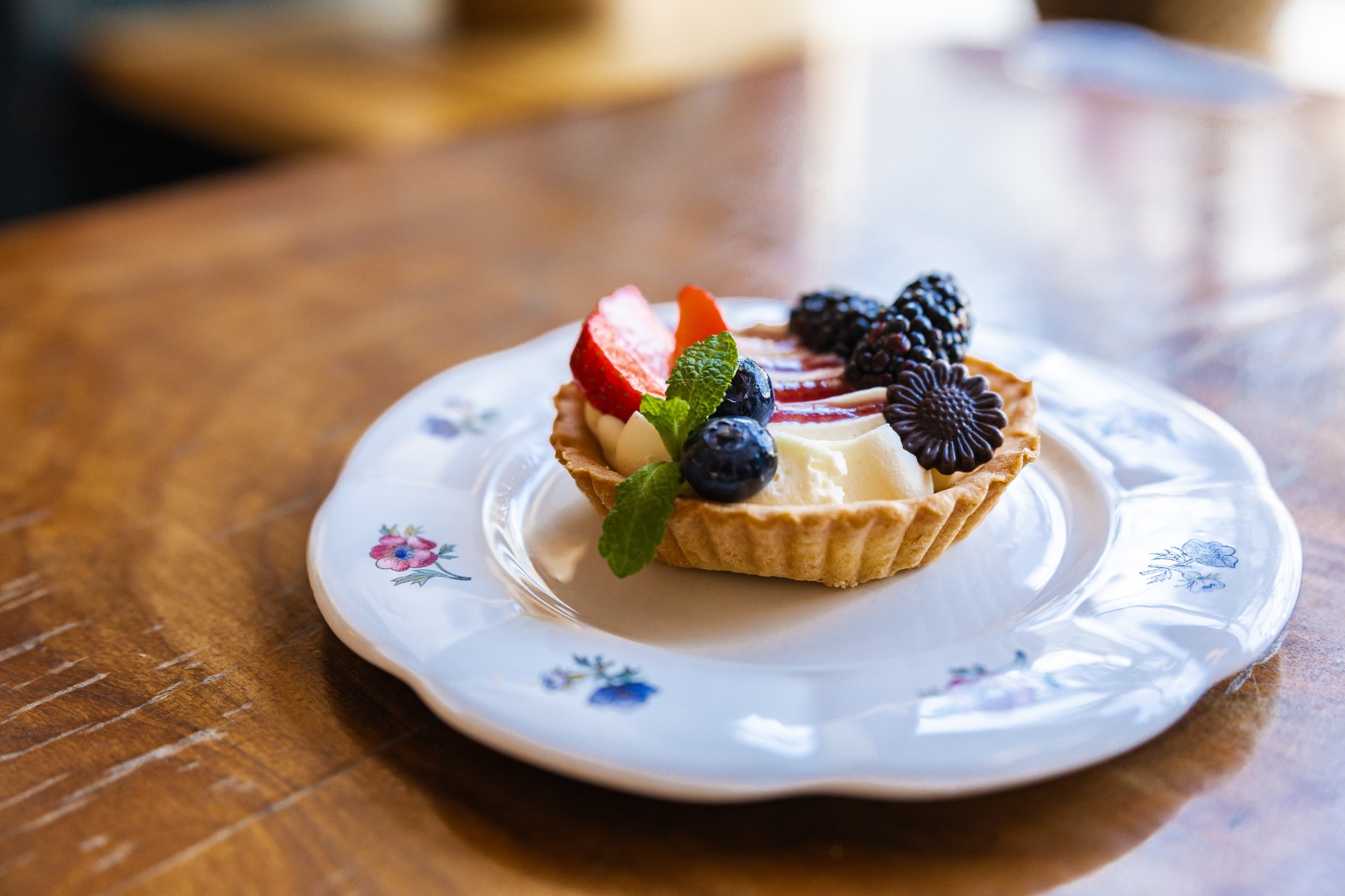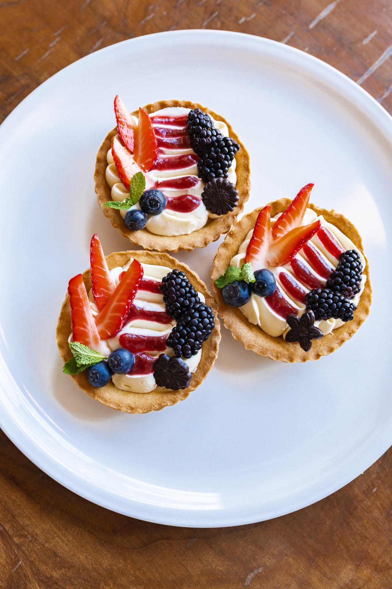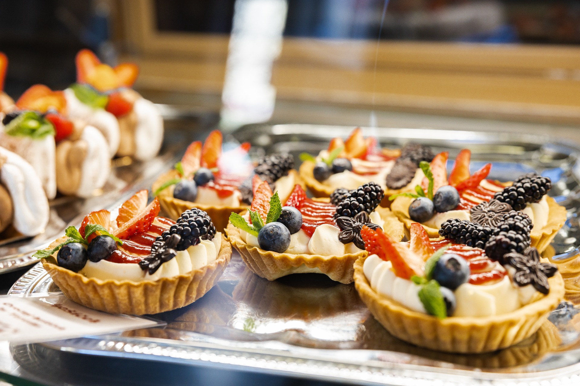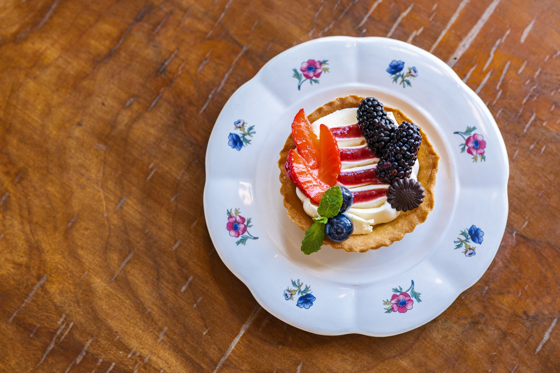 Domácí linecký košíček, ovocný rozvar, žloutkový krém, zdobený sezónním ovocem.