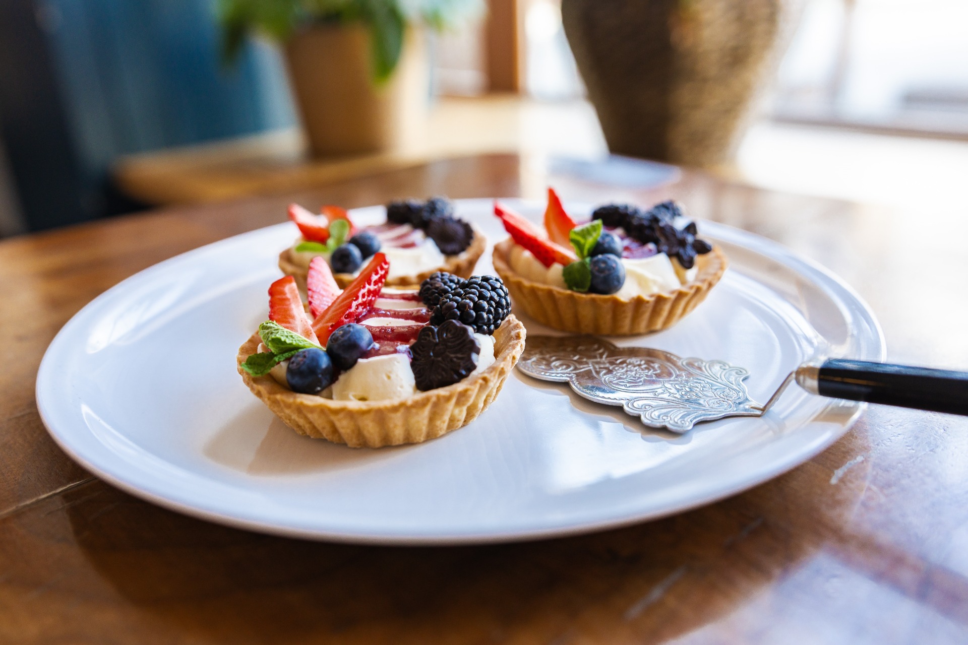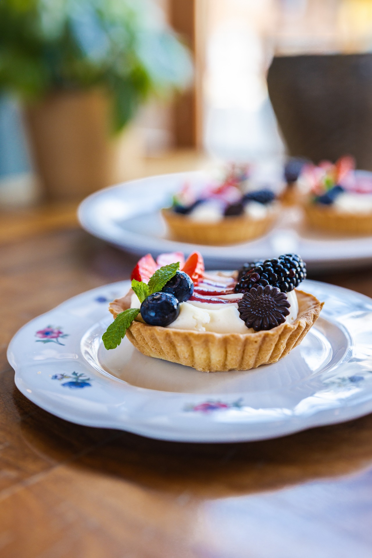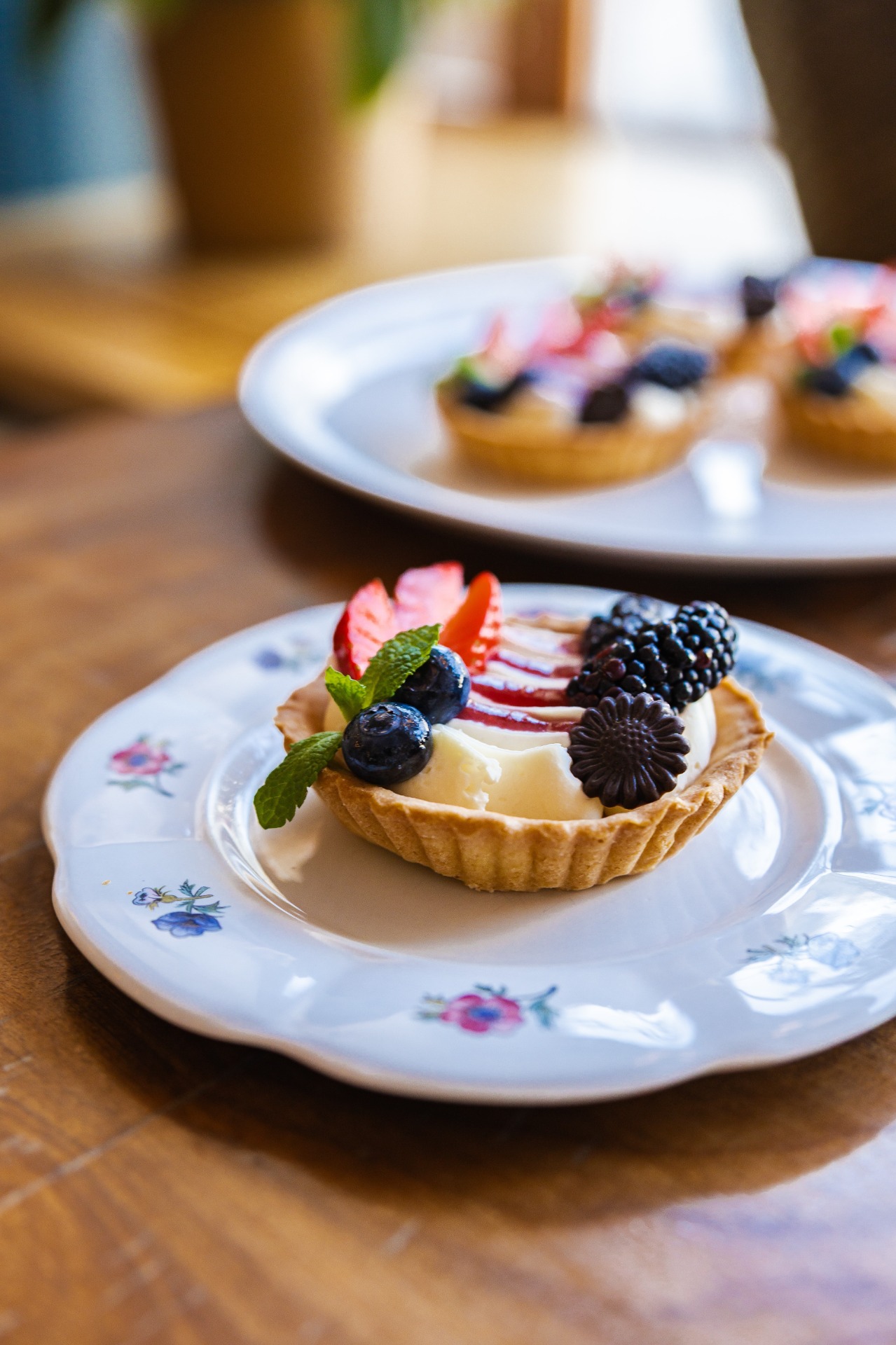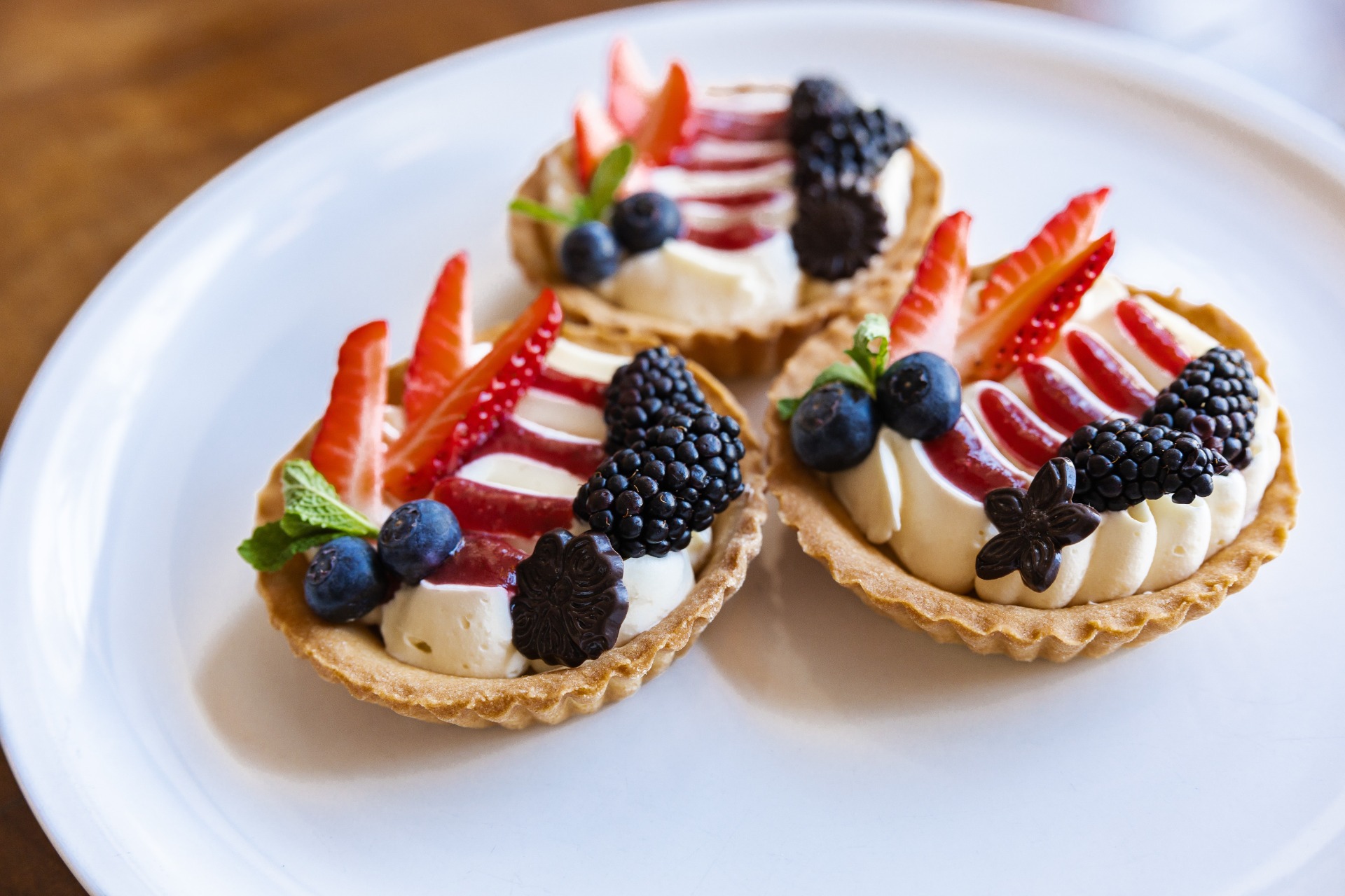 Domácí linecký košíček, ovocný rozvar, žloutkový krém, zdobený sezónním ovocem.